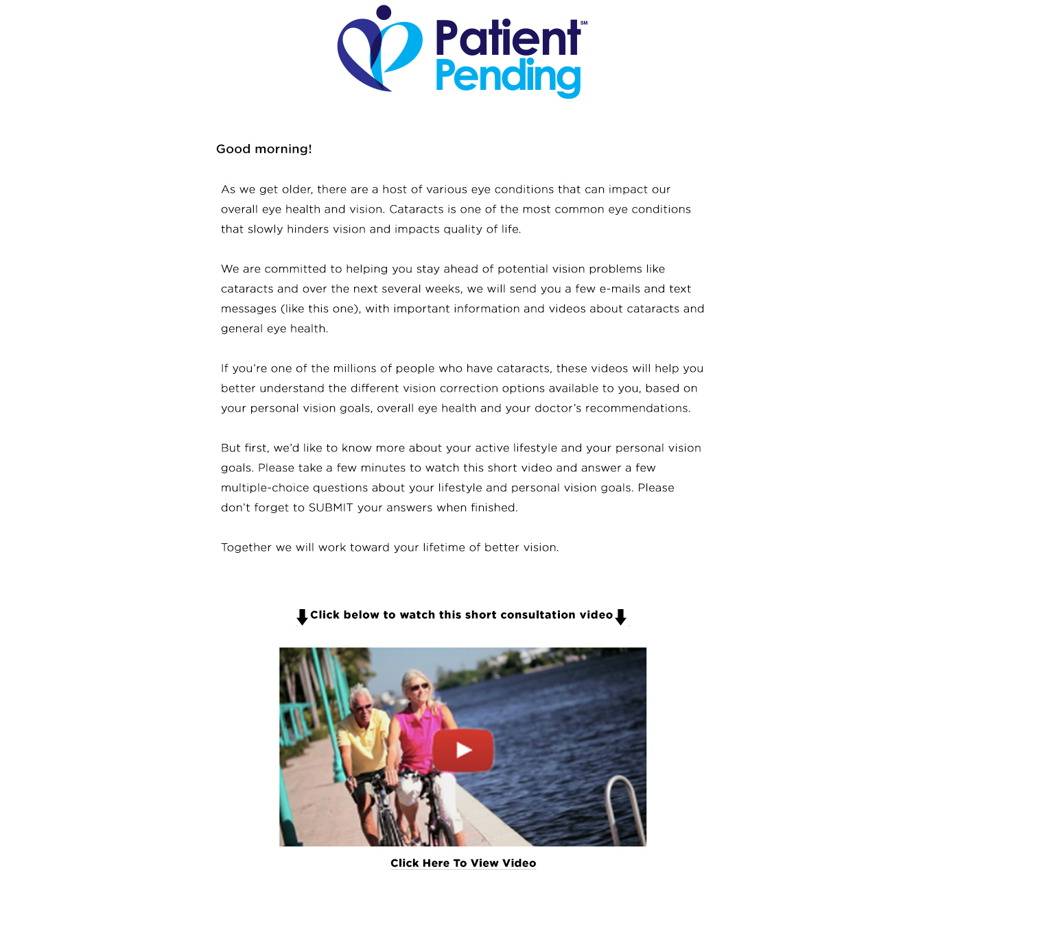 Patient PendingSM is a proprietary and fully-automated, multi-touchpoint, digital software application that directly connects with patients and prospects, educating them about specific products and services, BEFORE they come in for a consultation with the doctor.